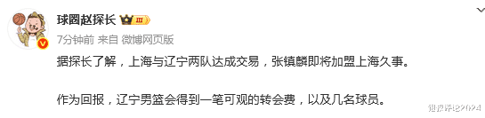 北京时间8月27日,根据媒体人赵探长的报道,辽宁男篮和上海男篮达成交易,张镇麟新赛季即将代表上海男篮效力,辽宁因此获得可观的转会费和数名球员。